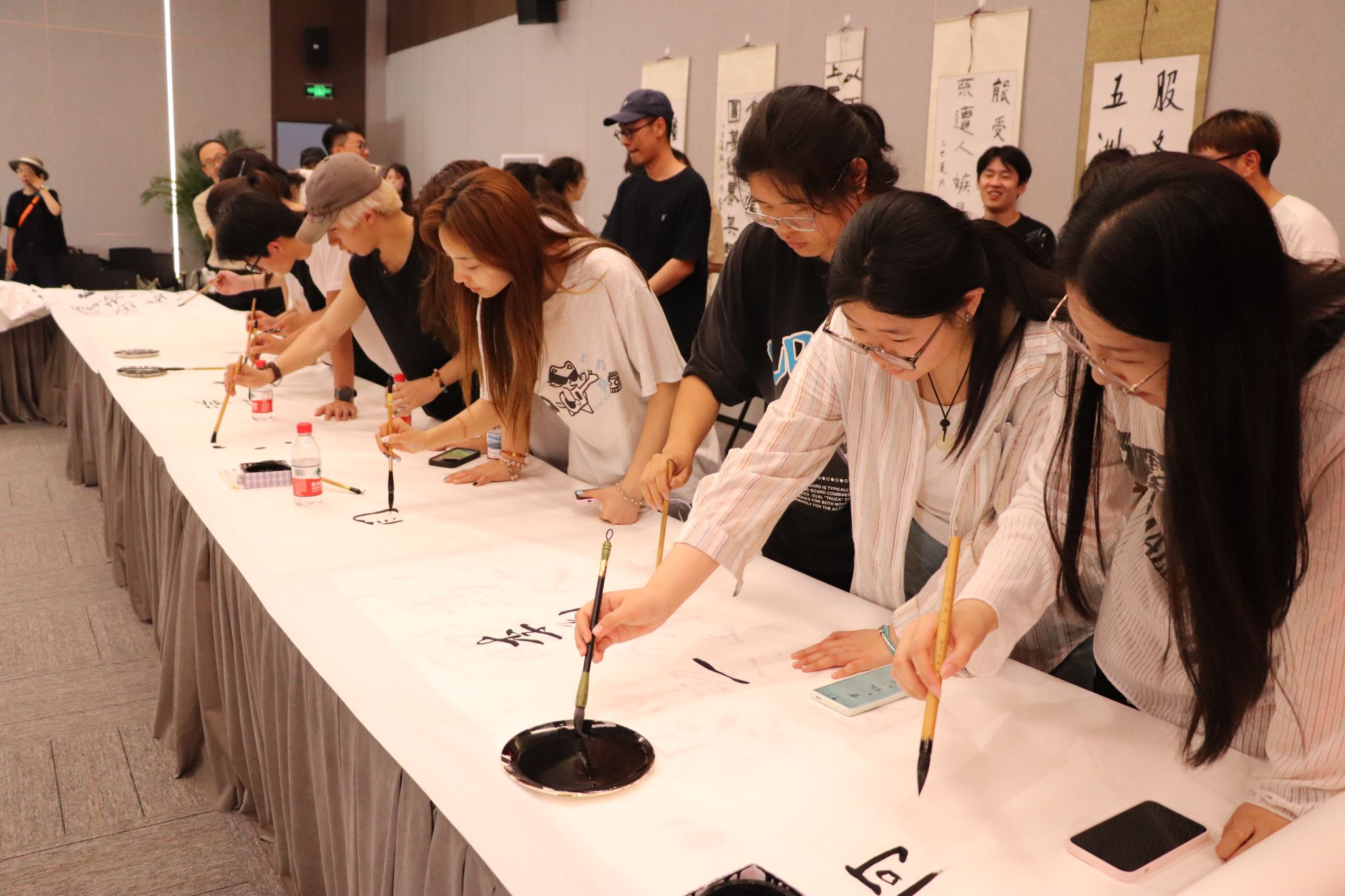 活动现场,创作交流环节气氛热烈而雅致。公司师生与中建八局书法爱好者、鲁美师生混合编组,在书法老师及骨干的指导下,围绕“建党104周年”主题挥毫泼墨。活动现场翰墨飘香,师生们或凝神静气,或笔走龙蛇,将爱党爱国之情倾注于笔端。大家相互观摩、交流心得,专家们则悉心指导、精准点评。创作过程不仅是一次技艺的切磋,更是一次思想的碰撞和情感的升华。众人齐心,笔墨接力,最终共同完成了一幅象征建党104周年的104米的书法长卷。这幅凝聚着对党无限忠诚与祝福的巨幅作品,成为本次活动最亮眼的成果,充分展现了公司师生昂扬向上的精神风貌和深厚的艺术素养。